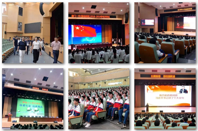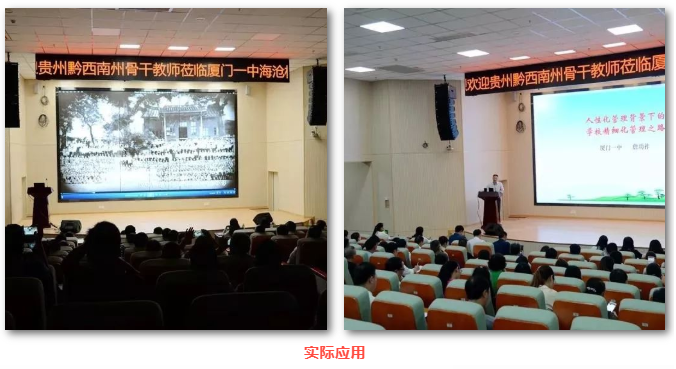 為保證出聲效果,千人大禮堂左右聲道采用RCF有源線陣音箱 HDL10-A 各8只,中置為 2只TT25-A有源全頻音箱,2只超重低音雙18”有源音箱SUB8006-AS ,臺唇4只HD10-A 有源音箱,返聽為ST系列。同時,整個禮堂還采用了16只 C3110作為輔助補聲,保證了所有座位都能聽到準確而清晰的聲音。