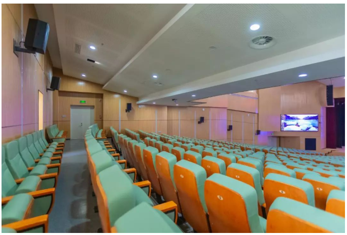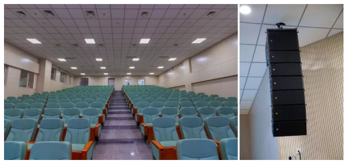 一樓300人的學術報告廳為階梯型,其擴聲系統采用RCF HDL6-A全頻有源線陣音箱+HDL12-AS有源低音音箱,是學校重要的學術交流以及公開課場所。由于該廳只有會議功能,兩組線陣即可滿足并保證每個座位的語音清晰度和完美的現場效果!