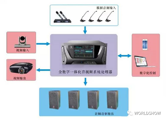 輸出端可以獨立完成對輸出端音頻的整理,包括音箱的標準化和聲學環境的補償處理、視頻終端的多窗口拼接處理、傳輸補償和控制系統的多種格式的控制信號的輸出等等。